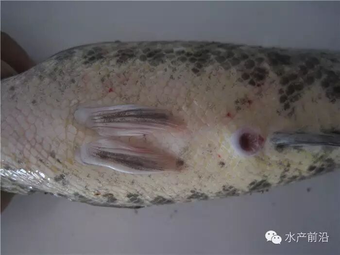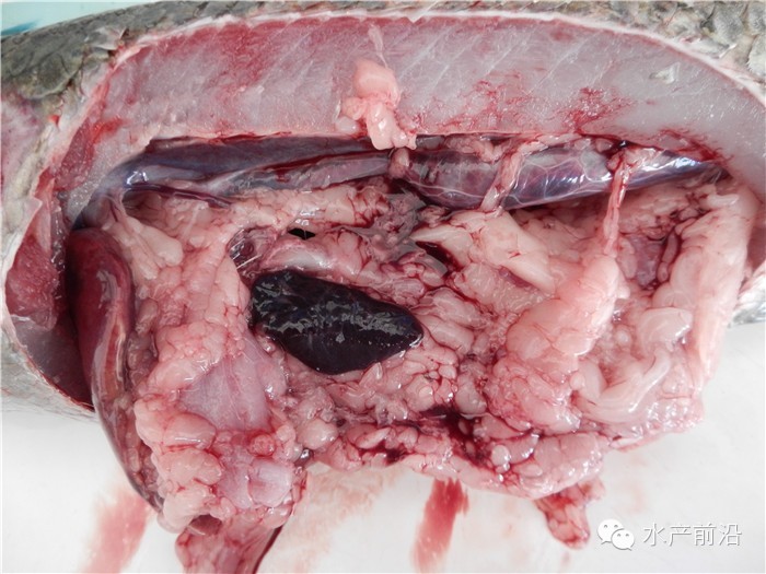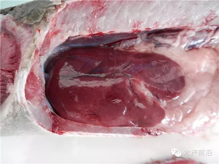 病魚一般表現(xiàn)為體色變黑,反應(yīng)遲鈍、呼吸困難,靠池塘邊漫游。病魚腹部膨大(圖1)、肛門紅腫(圖2),無其它明顯癥狀。解剖可見肝臟(圖3)、脾臟(圖4)和腎臟(圖5)嚴(yán)重腫大、出血,鰾嚴(yán)重出血,整個(gè)魚鰾都被出血斑塊覆蓋(圖6),胃和腸道空,無食物。
