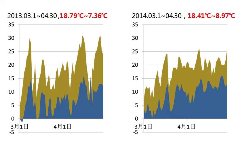3、4月間的光溫條件對河蟹的蛻殼具有決定性的作用。較高的水溫、充足的光照有利于河蟹的蛻殼;反之亦然。以2013、2014兩年早春的氣候?qū)Ρ,蛻殼情況與之呈正相關(guān)。晴好天氣時(shí)的蟹池水溫遠(yuǎn)高于氣溫。