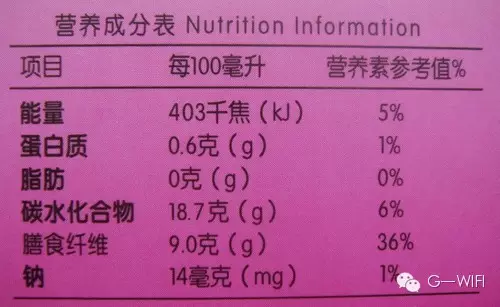 最右側(cè):營養(yǎng)素參考值百分比(NRV%)是指每100g(ml)或每份食品中該元素占RDA(成人每天推薦攝入量)的百分比。